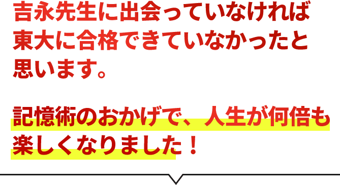 暗記や物を覚えることが非常に苦手だったのですが、吉永先生から学んだストーリー法や連想法などを活用し、センター試験では日本史で過去最高得点を取ることができました。もし吉永先生の本に出会っていなかったら、今の自分はなかったと思いますし、東大にも行けていなかったかもしれません。